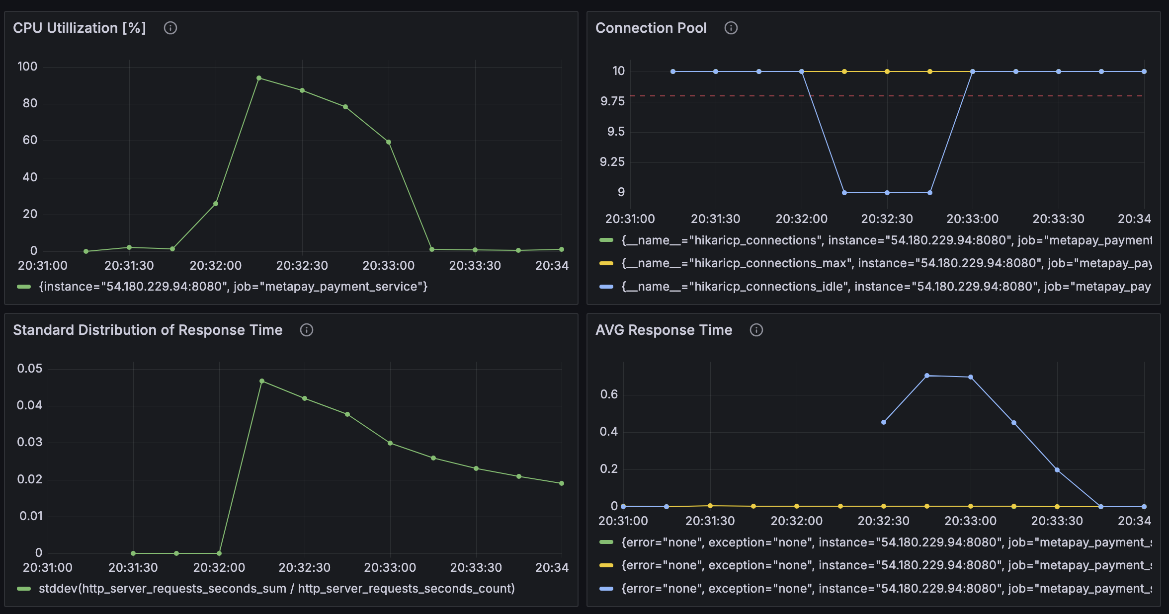 nGrinder 컨트롤러와 에이전트를 연결시키고, Prometheus와 Grafana를 이용해 메트릭을 수집하고 시각화하는 것까지 잘 되었다. 그런데 이상하게 어떤 조건에서도 CPU 점유율 양상이나, 평균 반응 시간 등의 그래프가 비슷한 양상을 띄었다. 분명히 조건이 달라진다면 반응도 달라져야 하는데, 언제나 똑같았다.